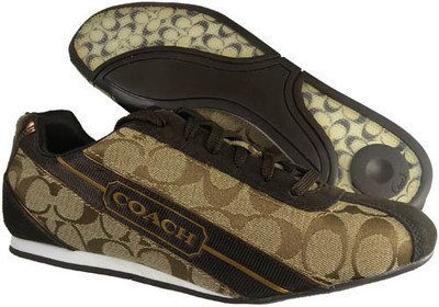 Signature fabric striped with the Coach emblem, accented by suede and touches of glossy patent leather.